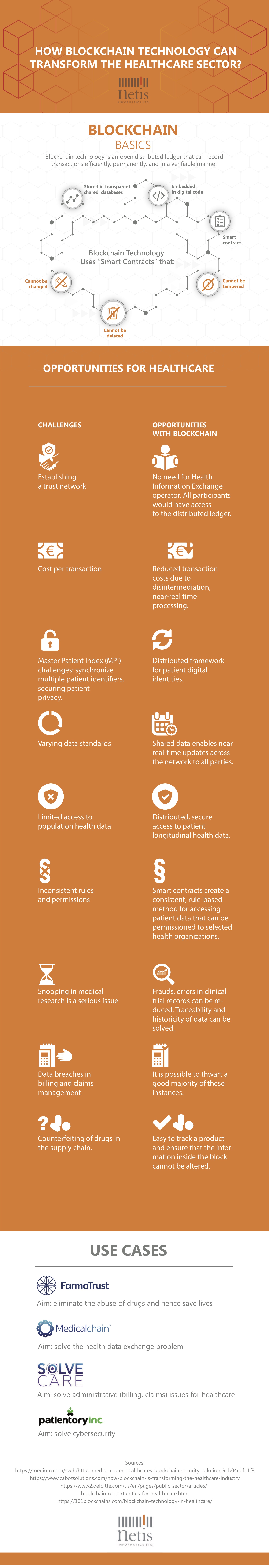 Blockchain technology is an open, distributed ledger that can record transactions efficiently, permanently, and in a verifiable manner. This technology is used across many industries, mainly the financial sector, food safety, logistics, but also in healthcare.